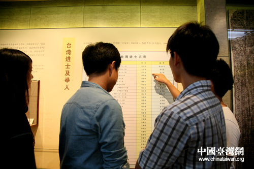 16日下午,來自清華大學、北京大學、中國人民大學、中央民族大學等六所高校的150多名臺灣學生參觀了位于前門附近的臺灣會館。圖為臺生們在臺灣進士及舉人名表上尋找同姓進士。(中國臺灣網 普燕攝)
