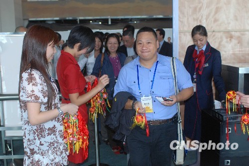 十月十九日,澳門-南寧航線開通,參加中國-東盟博覽會的澳門企業家代表團成為首批乘客之一。該航線由澳門航空公司經營,這是澳航繼桂林航點后開通的第二條澳門至廣西航線。 中新社發 畢永光 攝