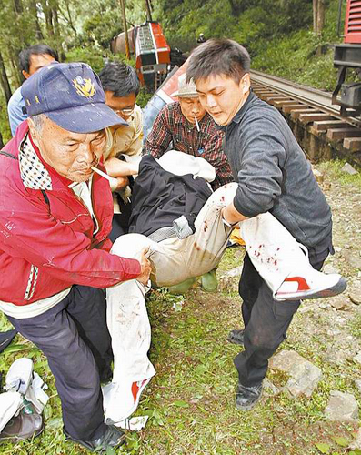 緊急救援,沒受傷的游客加入救人行列,幫忙抬傷者就醫。圖片來源:臺灣媒體
