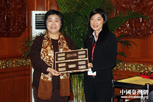 中國宋慶齡基金會聯絡部副部長宋建(左)和臺灣十杰基金會人員互贈禮物(中國臺灣網 郜利敏 攝)