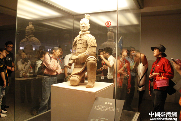 臺灣經貿代表團嘉賓正在觀賞“跪射俑”。(中國臺灣網 芮益芳 攝)