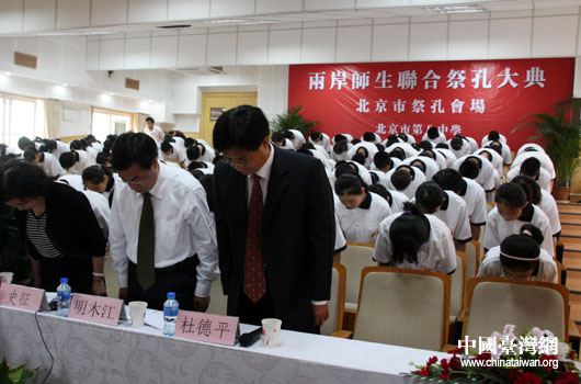 北京市臺辦副主任杜德平表示,北京八中是北京市先進學校的代表,會同臺灣忠信中學共同舉辦祭孔大典,對于京臺兩地師生交流非常有意義,有助于兩岸師生樹立振興中華民族的偉大志向。他說,隨著兩岸形勢的發展,京臺兩地此類交流活動發展的會更好,領域會更加廣闊。