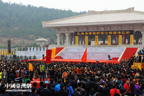 中國(guó)臺(tái)灣網(wǎng)4月4日黃陵消息 4月4日上午癸巳年(2013)清明公祭軒轅黃帝典禮在陜西黃陵縣舉行,萬(wàn)余名海內(nèi)外中華兒女聚首陜西省黃陵縣橋山軒轅殿祭祀廣場(chǎng),追念初祖功德,表達(dá)追思之情。