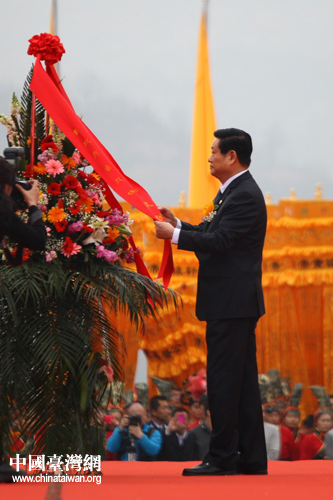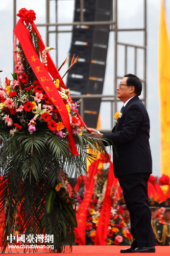 第十一屆全國(guó)人大常委會(huì)副委員長(zhǎng)華建敏,中國(guó)國(guó)民黨原副主席、海基會(huì)原董事長(zhǎng)江丙坤及夫人陳美惠,新黨主席郁慕明,以及來(lái)自中央國(guó)家機(jī)關(guān)、全國(guó)各省市區(qū)和海外的參祭代表分別向始祖敬獻(xiàn)了花籃。(中國(guó)臺(tái)灣網(wǎng)記者 楊麗)