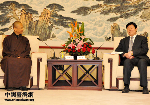 山東省副省長賈萬志在濟南會見臺灣中臺禪寺男眾部副住持、專任研經(jīng)院院長釋見護。(圖片來源:山東省臺辦)