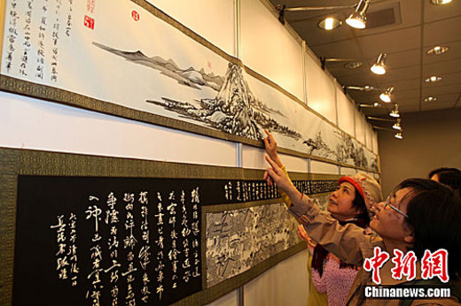 3月7日下午,出自大陸名家之手的長幅剪紙藝術(shù)作品《富春山居圖》(上)、《清明上河圖》,一同亮相張家口蔚縣民俗文化藝術(shù)展,吸引臺灣民眾駐足欣賞、評頭品足。中新社發(fā) 董會峰 攝