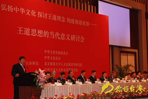 4月22日上午,“弘揚中華文化探討王道理念構建和諧世界——王道思想的當代意義研討會”在江蘇省南京市開幕,海峽兩岸及香港地區專家學者和企業界、科技界等有影響的嘉賓100余人,就兩岸如何合作弘揚中華傳統文化、王道思想的當代意義、王道思想對構建和諧世界的啟示等進行研討。中共江蘇省委副書記朱善璐,中臺辦、國臺辦副主任孫亞夫,中華文化發展文化促進會副會長辛旗先后在開幕式上致辭。前全國人大常委會副委員長、中華文化發展促進會會長許嘉璐和臺灣中華文化總會會長劉兆玄出席開幕式并致辭和專題演講。
