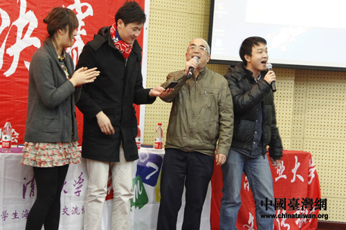 北京臺聯榮譽主席盧咸池和北京大學臺灣研究會小組的選手共同演唱《外婆的澎湖灣》。(中國臺灣網 郜利敏 攝)