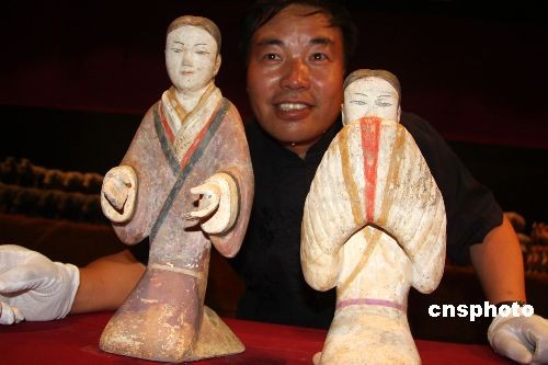 圖為陜西漢陽陵考古陳列館副館長王保平在展示造型精美的跽坐狀侍女俑和拱手女傭。中新社發 董會峰 攝