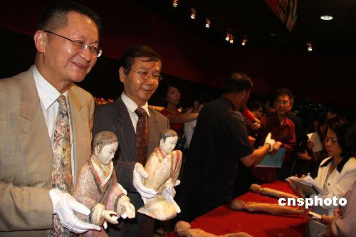 圖為臺灣金傳媒集團執行長楊仁烽(左一)、臺北歷史博物館館長黃永川(左二)面帶微笑,向記者展示彩繪女陶俑。中新社發 董會峰 攝