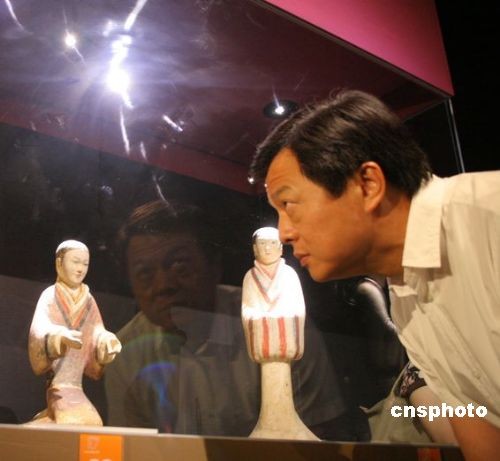 6月27日,“微笑彩俑—漢景帝的地下王國”特展在臺北歷史博物館正式開展,首日即出現人潮。圖為一向對雕塑藝術有興趣的臺北縣長周錫瑋,在專注觀賞塑衣式彩繪跽坐拱手女俑。中新社發 董會峰 攝