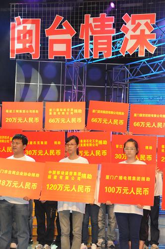 8月19日,社會各界在賑災晚會上紛紛捐款獻愛心。當日,福建省舉行福建同胞援助臺灣災區賑災晚會,幫助在臺風“莫拉克”中受災的臺灣同胞渡過難關。福建省紅十字會當晚接受社會各界捐助人民幣8681萬多元。新華社記者 張國俊 攝