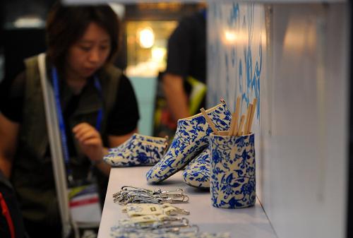 9月17日,一位買家在交易會上觀看臺商的“青花瓷”系列創意產品。新華社記者 姜帆 攝