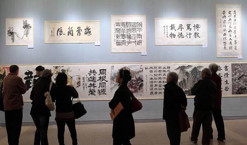 10月28日,觀眾在北京舉行的“海峽兩岸書畫家交流活動作品展”上欣賞書法繪畫作品。 新華社發(fā)(羅偉 攝)