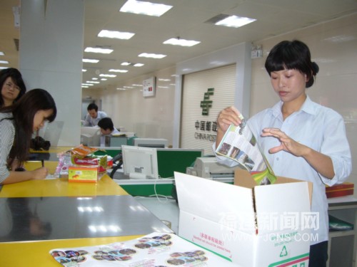 11月10日,“閩臺一家親”福州對臺包裹旅游搭載宣傳活動在福州啟動,在對臺包裹中搭載大陸旅游宣傳資訊,在大陸尚屬首創。圖為郵局工作人員在在包裹里放旅游宣傳廣告單。 (詹托榮 攝)