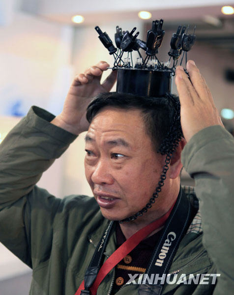 11月28日,一位臺灣展商向觀眾介紹自己的創意作品“充電學士帽”。