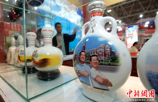 5月18日,貼有馬英九、蕭萬長肖像的臺灣白酒亮相第十二屆海交會。當日,由國臺辦、中國貿促會、海關總署、國家質檢總局和福建省政府共同主辦的第十二屆海峽兩岸經貿交易會、第七屆中國福建商品交易會在新落成的福州海峽國際會展中心開幕,近萬名海內外客商赴會。中新社發 王東明 攝