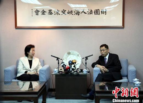 10月27日,大陸海協(xié)會(huì)副秘書(shū)長(zhǎng)張勝林等抵達(dá)臺(tái)灣,了解在臺(tái)灣蘇花公路失蹤的20名大陸同胞的搜救進(jìn)展情況。圖為張勝林(左)下午會(huì)見(jiàn)海基會(huì)副董事長(zhǎng)高孔廉。中新社記者 陳立宇 攝