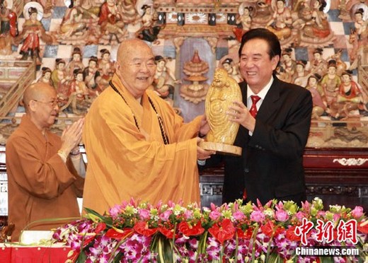 2月24日下午,大陸海協(xié)會(huì)會(huì)長陳云林一行來到有“南臺(tái)佛都”之稱的高雄佛光山參訪,受到星云法師及僧眾的熱烈歡迎。圖為陳云林(右)向星云法師贈(zèng)送木雕佛像。中新社記者 符永康 攝