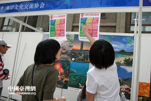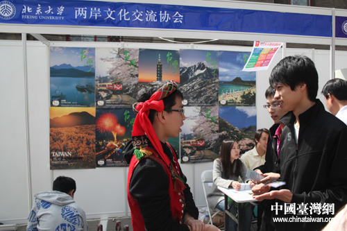 圖為北京大學(xué)兩岸文化交流協(xié)會展位的招貼海報(bào)吸引了學(xué)生駐足咨詢。(中國臺灣網(wǎng) 普燕 攝)