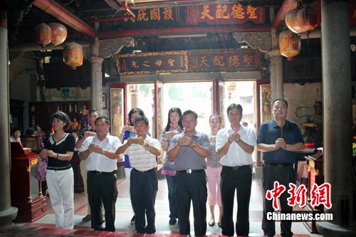8月4日,臺(tái)灣高雄縣前縣長(zhǎng)楊秋興(前左三)率團(tuán)前往“媽祖故里”福建湄洲島參訪期間,到媽祖祖廟“天后宮”祭拜媽祖。楊秋興稱自己的生日是3月23日,與媽祖同一天出生,到媽祖祖廟拜謁媽祖是他一直的夙愿。楊秋興此次率團(tuán)首次到福建開(kāi)展“宗教朝圣之旅”,以期用宗教、民俗文化加深兩岸的交流交往。(王華育 攝)