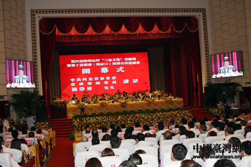 中國臺灣網8月8日張家口消息 8月8日下午,第四屆海峽兩岸“三祖文化”交流周暨第十屆冀臺經濟合作洽談會在張家口舉行。中共中央臺辦、國務院臺辦主任王毅,海協會會長陳云林,河北省委常委、副省長楊崇勇以及中國國民黨副主席林豐正、全國臺企聯會長郭山輝等1200多位兩岸各界人士出席開幕式,河北省委副書記付志方宣布洽談會開幕。