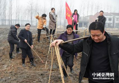 襄陽市臺辦工作人員進村挖堰塘。(圖片來源:襄陽市臺辦)