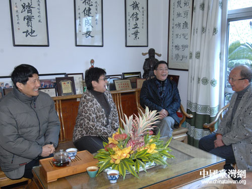 上海市臺辦主任李文輝(右二)、副主任瞿國樑(左一)慰問臺商李廣仁夫婦及家人。(圖片來源:上海臺辦)