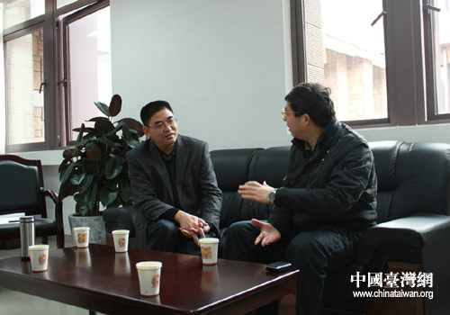 綿陽市臺辦主任陳福林(右)與北川縣委常委、組織部長淳道懷(左)座談交換基層對臺工作意見。(圖片來源:綿陽市臺辦)