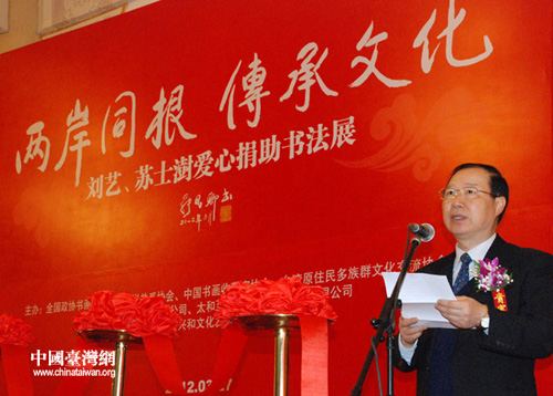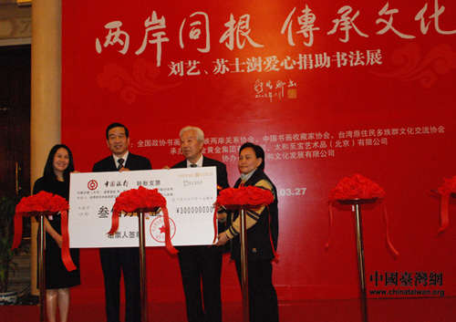 中國臺灣網(wǎng)3月28日北京消息 由全國政協(xié)書畫室、中國書畫收藏家協(xié)會主辦的“兩岸同根,傳承文化——劉藝、蘇士澍愛心捐助書法展”昨日上午在全國政協(xié)禮堂隆重舉行。活動共展出劉藝、蘇士澍兩位當代著名書法家作品80余幅。同時,兩位名家還當場向臺灣省花蓮縣秀林鄉(xiāng)捐贈人民幣300萬元籌建“愛心圖書館”。原全國政協(xié)副主席、政協(xié)書畫室主任張思卿,海峽兩岸關系協(xié)會副會長王在希,臺灣地區(qū)少數(shù)民族民意代表高金素梅等出席活動。