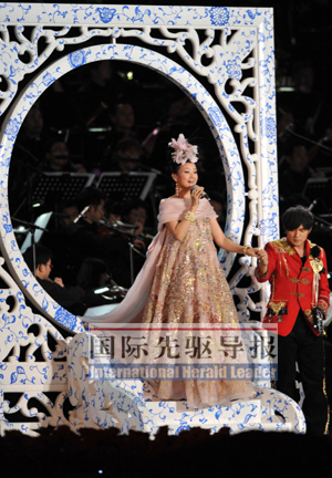 引發兩岸媒體和網友熱評的“英倫組合”在臺灣并不是人盡皆知。圖為今年6月30日,宋祖英、周杰倫在北京國家體育場“鳥巢”合唱《千里之外》。本報記者 金良快/攝