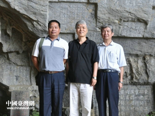 英德政協文史委林超富主任與兩位教授在碧落洞摩巖石刻前合影(圖片來源:英德市臺辦)