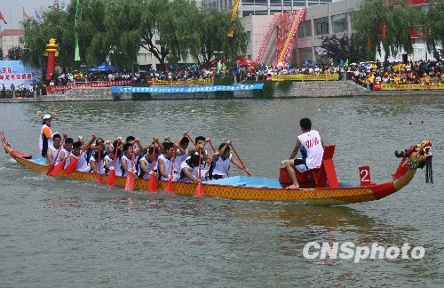 6月12日,端午節(jié)前夕,首屆海峽兩岸龍舟邀請(qǐng)賽在山東臺(tái)兒莊的京杭大運(yùn)河上舉行,來自美國(guó)、法國(guó)、波蘭以及臺(tái)灣、浙江、江蘇和本地等國(guó)家和地區(qū)的14支代表隊(duì)的366名選手參加了本屆端午節(jié)前的賽龍舟活動(dòng)。 中新社發(fā) 閆峰 攝