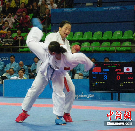 在11月26日結束的廣州亞運會空手道女子68公斤級決賽上,中國選手馮蘭蘭3比0擊敗日本選手本間繪美子,摘得了中國代表團本屆亞運會第184枚金牌。中國金牌總數超越了1990年北京亞運會上創造的183枚的歷史紀錄。雖然廣州亞運會尚未結束,但中國隊已經創下了單屆亞運會一個國家獲得冠軍最多的新紀錄。中新社記者 張羽攝