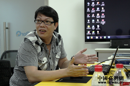 臺灣著名漫畫家林政德向兩岸媒體介大型昆曲元素3D動畫片《粉墨寶貝》相關情況。(中國臺灣網 王偉 攝)