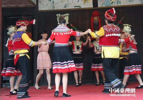 臺灣非凡電視臺記者與廣西少數(shù)民族進行互動表演。(圖片來源:廣西臺辦)