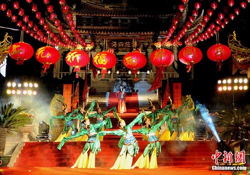 11日晚,福建湄洲媽祖祖廟舉行2011年海峽兩岸慶賞元宵佳節(jié)媽祖燈會文藝晚會,兩岸藝術(shù)團的精彩表演吸引眾多游客、信眾及島上居民駐足觀看。當(dāng)日,以“媽祖親緣,情系兩岸;同祈上元,共享升平”為主題的2011年海峽兩岸慶賞元宵佳節(jié)媽祖燈會在福建湄洲媽祖祖廟、臺灣云林北港朝天宮同時啟動,此次活動將延續(xù)至農(nóng)歷正月十五。中新社記者 劉可耕 攝