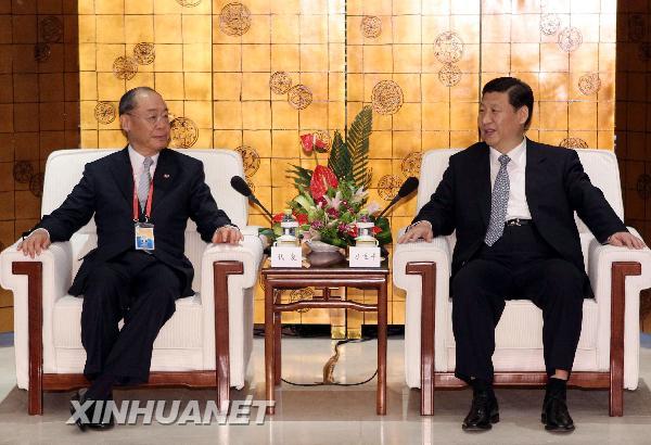 4月10日,國家副主席習近平在海南省博鰲會見出席博鰲亞洲論壇2010年年會的臺灣兩岸共同市場基金會最高顧問錢復。 新華社記者樊如鈞攝