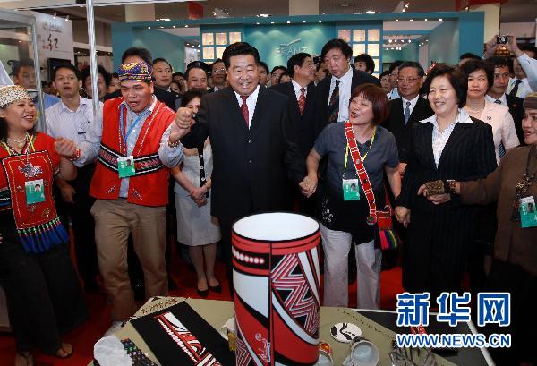 6月19日,中共中央政治局常委、全國政協主席賈慶林在福建省廈門市參觀第三屆海峽兩岸文化產業博覽交易會展館。這是賈慶林在臺灣少數民族工藝品展區和身著民族服裝的臺灣少數民族同胞手拉手跳起歡快的舞蹈。 新華社記者 龐興雷 攝