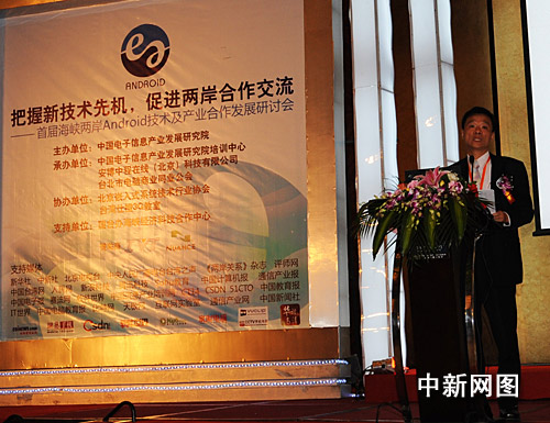 圍繞開源手機(jī)操作系統(tǒng)Android技術(shù)與應(yīng)用的首屆“海峽兩岸Android技術(shù)及產(chǎn)業(yè)合作發(fā)展研討會”,十五日在北京舉行。來自兩岸的專家及業(yè)者代表五百多人參加了會議。圖為臺北市電腦公會副總干事張?bào)以跁习l(fā)言。 路梅 攝