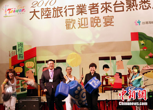 12月3日,大陸新增6省區(qū)赴臺(tái)游的旅游業(yè)者組團(tuán)訪臺(tái)踩點(diǎn),臺(tái)灣海峽兩岸觀光旅游協(xié)會(huì)及臺(tái)灣旅行業(yè)界為此在臺(tái)北舉行晚宴歡迎。自2010年7月18日起,內(nèi)蒙古、西藏、甘肅、青海、寧夏、新疆6省區(qū)新增為大陸居民赴臺(tái)旅游的開(kāi)放區(qū)域。圖為踩點(diǎn)團(tuán)團(tuán)長(zhǎng)、大陸海峽兩岸旅游交流協(xié)會(huì)副秘書(shū)長(zhǎng)李亞瑩與臺(tái)灣海峽兩岸觀光旅游協(xié)會(huì)副會(huì)長(zhǎng)劉喜臨在晚宴上共同擊鼓助興。中新網(wǎng)發(fā) 黃少華 攝