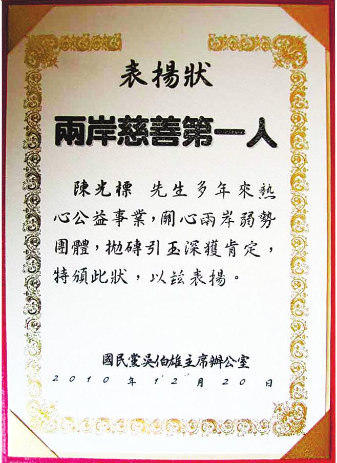 陳光標來到祖國寶島臺灣,受到臺灣各界高度評價和熱烈歡迎。他們認為,陳光標來到臺灣,傳遞了兩岸人民血脈之情。