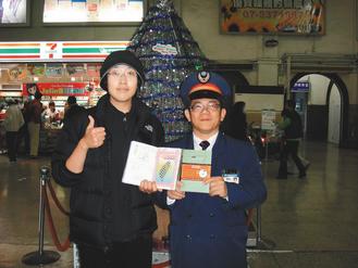 來自北京的交換學(xué)生傅超(左)臺南站集滿百戳,與臺南站長陳榮彬合影。圖片來源:臺灣《聯(lián)合報》
