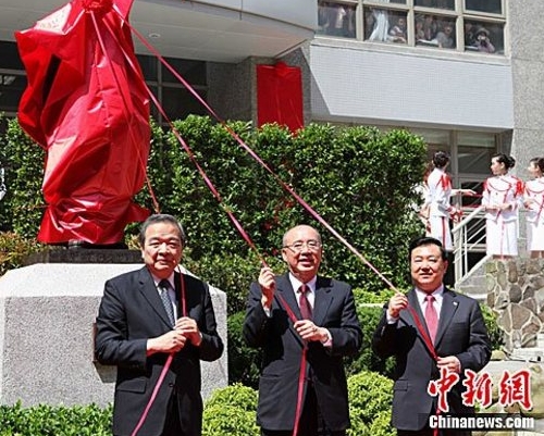 安徽省長王三運20日率安徽省經貿文化參訪團來到臺灣銘傳大學桃園校區,向該校贈送一尊劉銘傳銅像。圖為王三運(右)與中國國民黨榮譽主席吳伯雄(中)、銘傳大學校長李銓(左)共同為銅像揭幕。中新社發 路梅 攝