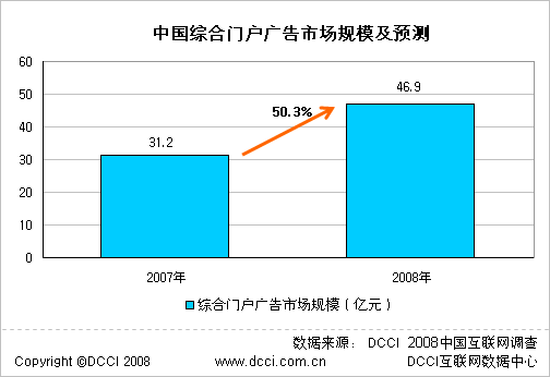 1月21日,DCCI互聯網數據中心主辦,中國互聯網協會指導的2007-2008中國互聯網市場數據發布會的《Netguide2008中國網絡廣告市場調查研究報告》顯示:2007年中國綜合門戶廣告市場規模為31.2億元 DCCI預計2008年將增至約46.8億元,增長率為50.3%。搜狐與新浪營收可能持平,騰訊增長速度最快,網易相對滯后,TOM.COM基本淡出,MSN中國門戶、雅虎中國門戶、中華網分食特定主題的細分市場。