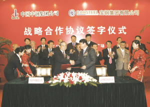12月5日,中國中鋼集團公司、寶鋼集團公司在北京簽署戰略合作協議。雙方均表示將在已有合作的基礎上,重點在鐵礦石、鉻礦等原料的供應、鉻鐵與鎳鐵等鐵合金的供應、設備和資材備件的供應、海內外的資源開發、技術交流與合作以及工程技術等領域開展全方位、深層次的合作。期間,寶鋼集團董事長徐樂江在接受記者采訪時,否認了“寶鋼收購力拓”的報道。