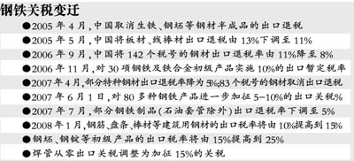 根據財政部頒布的《2008年關稅實施方案》,鋼筋、盤條、棒材等建筑用鋼材的出口稅率將由10%提高到15%,鋼坯、鋼錠等初級產品的出口稅率將由15%提高到25%,而焊管從零出口關稅調整為加征15%的關稅,不過,熱軋鋼材產品的出口稅率此次沒有調整,依然為5%,而冷軋鋼材產品和無縫鋼管依然擁有出口退稅權利,不加收任何關稅。