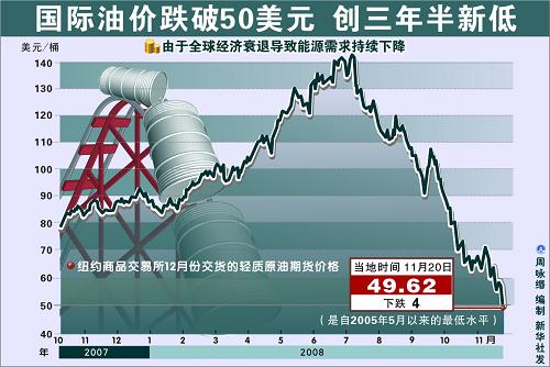 由于經濟衰退導致能源需求持續下降,國際油價上周累計下跌約12%,紐約市場油價更是跌破了每桶50美元,上周五紐約商交所一月輕質原油期貨結算價報收于每桶49.93美元。從7月11日創下每桶147.27美元的歷史最高記錄以來,國際油價已經累計下跌六成多。