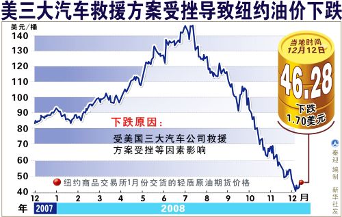 受美國三大汽車公司救援方案受挫等因素影響,12月12日國際油價下跌,紐約油價跌至47美元之下。