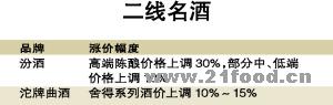 另一方面,楊清山認為中低檔白酒很大一部分屬于區域性品牌,調價后消費者的反應也只是局限在區域市場,不如茅臺、五糧液等一線品牌那樣牽一發動全身;而且調整幅度遠低于一線名優酒,在食品價格持續上漲的前提下,消費者對此并不抵觸。
